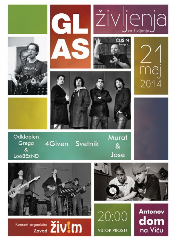 Vabljeni na nepozabni glasbeni dogodek, Glas življenja - ZA življenje, ki bo 21. maja 2014, ob 20.00, v Antonovem domu na Viču. Večer organizira Zavod Živim. Nastopili bodo Murat&Jose, Odklopljen Grega in Loobeznd ter 4Given. Vstop je prost. Pridite na zvrhano vero veselja, ki ga bomo prejeli v sproščenem druženju, ob odlični glasbi in ob popestritvi hudomušnih domislic igralca Gregorja Čušina. O koncertu smo govorili v Dijaški oddaji, v kateri so se nam pridružili član skupine 4Given Matej Virtič, Odklopljen Grega in Katarina Nzobandora.