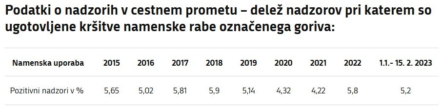 »Finančna uprava je analizirala podatke o izvedenih nadzorih nad rabo goriva za kmetijstvo med 1. januarjem 2023 in 15. februarjem 2023. V116 izvedenih nadzorih pri upravičencih do nakupa goriva za kmetijstvo je bila ugotovljena le 1 kršitev, ko se to gorivo ni nahajalo v kmetijski mehanizaciji. Pri običajni kontroli uporabe označenega goriva na cestah (ne glede ali gre za upravičenca do nakupa GK ali ne) pa je delež kršiteljev znašal 5,2 %, kar je povsem primerljivo s preteklimi leti. Torej, zaradi ukrepa vlade oziroma spremembe zakonodaje delež odkritih nepravilnosti ni porasel« so zapisali v sporočilu Finančne uprave Republike Slovenije.